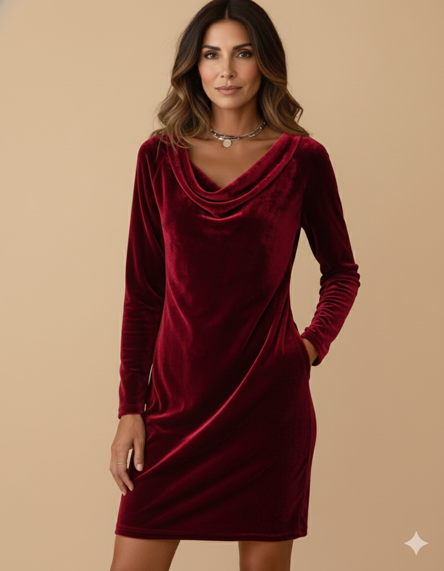 Eleganza, comfort e un tocco di luminosità invernale: Alessia™ | Abito in velluto Frosina è pensato per valorizzare ogni donna con una linea morbida e raffinata.